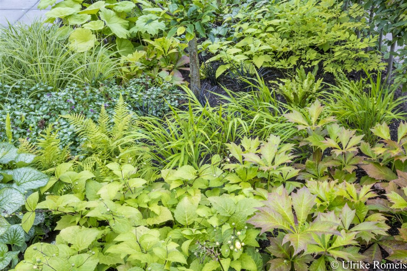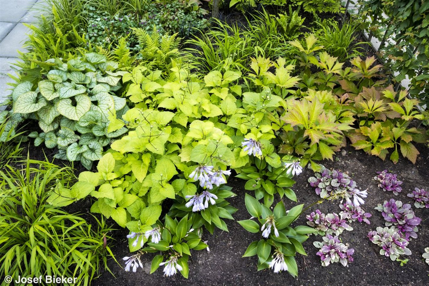 Enkele plantensoorten in dit mengsel Rodgersia, Hosta, Epimedium, Hemerocallis met enkele soorten varens en siergrassen. Fleur Dansante® wordt op beeld geleverd. Afhankelijk van externe omstandigheden, zoals weer, bodem en omgeving, kunnen de kleuren enigszins afwijken. Afhankelijk van de grootte van het plantvak kunnen andere plantsoorten worden gebruikt dan weergegeven op de sfeerbeelden.