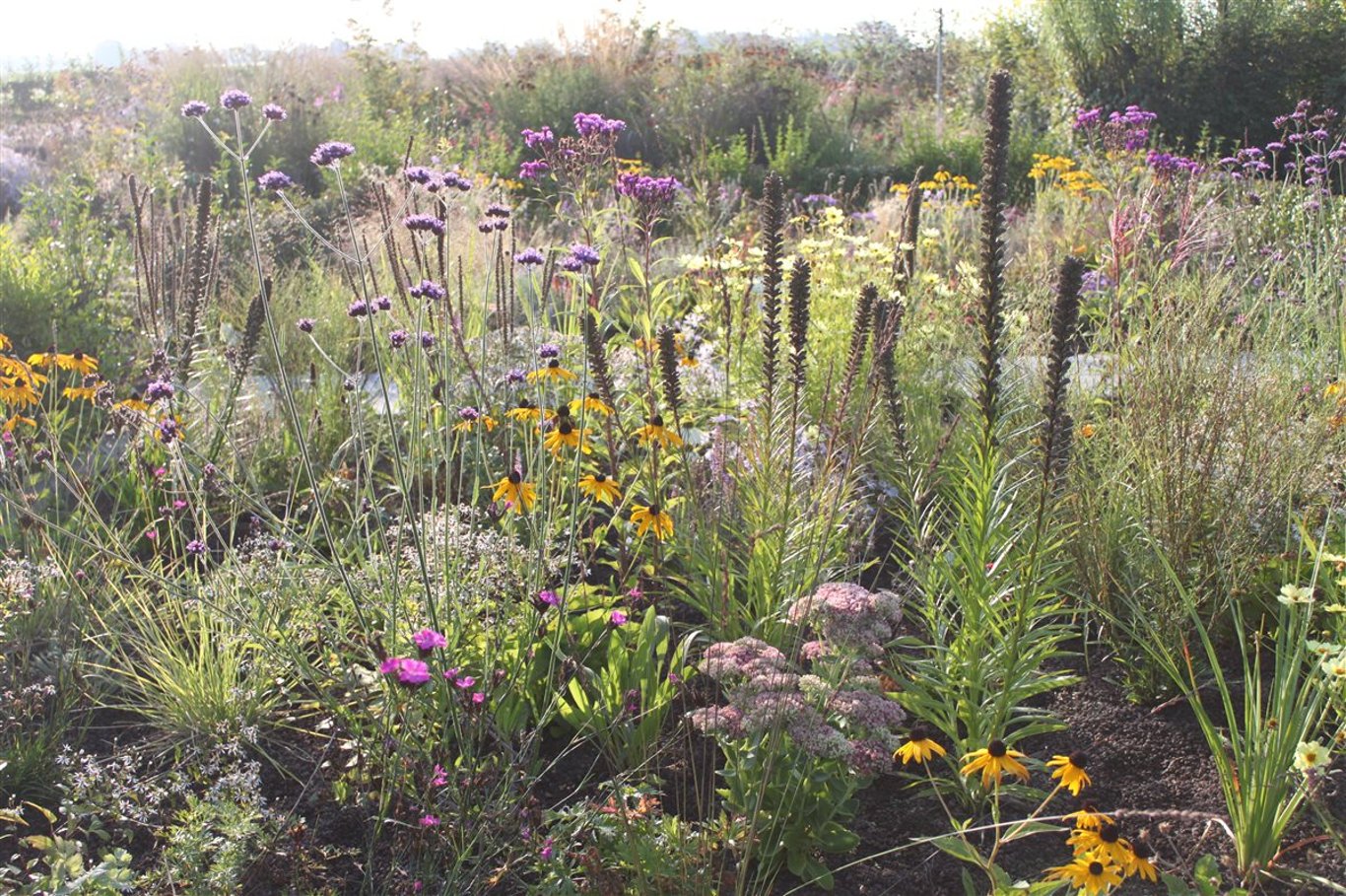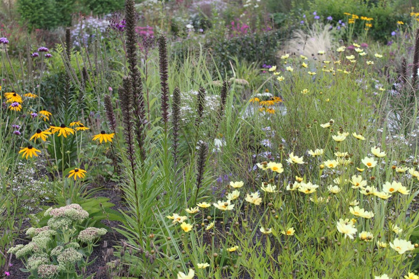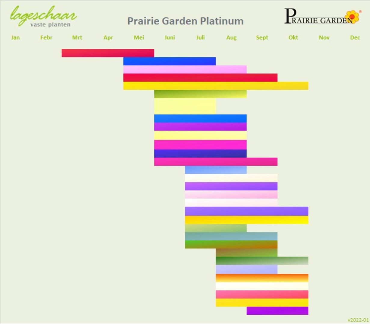 Enkele plantensoorten in dit mengsel Hemerocallis, Thalictrum, Salvia, Echinacea, Aster, Verbena, Kniphofia, Vernonia en verschillende hoge siergrassen. Het kleurenschema en de foto’s geven een impressie van de kleurschakering van de betreffende kant-en-klare Prairie Garden® plantcombinatie. Prairie Garden® wordt op beeld geleverd. Afhankelijk van externe omstandigheden, zoals weer, bodem en omgeving, kunnen de kleuren enigszins afwijken. Afhankelijk van de grootte van het plantvak kunnen andere plantsoorten worden gebruikt dan weergegeven op de sfeerbeelden.